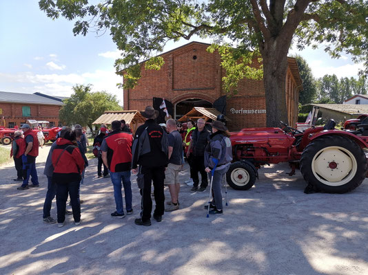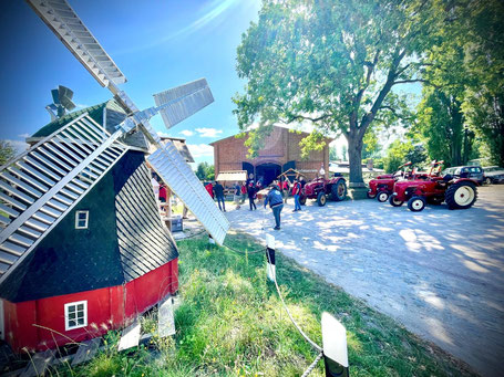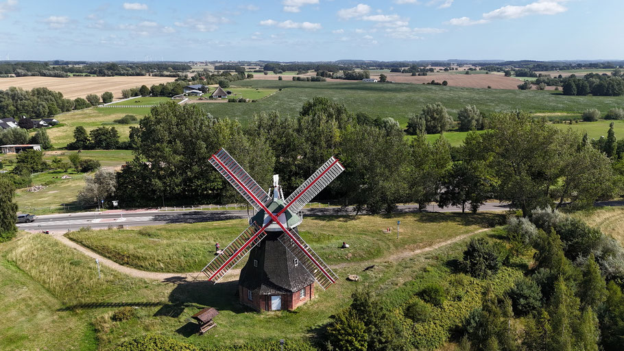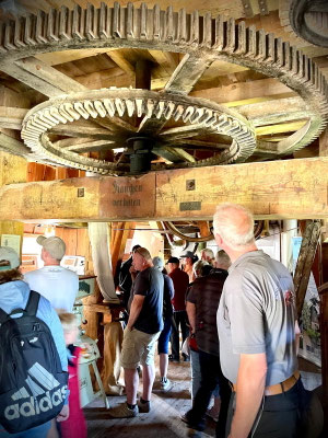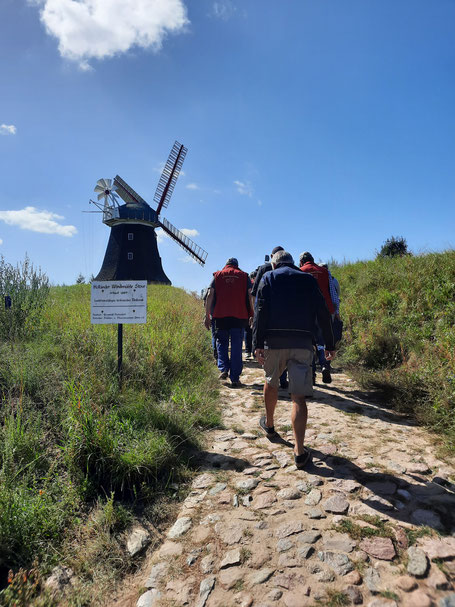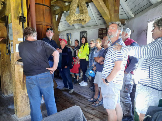 Letzter Tagespunkt für heute, Besichtigung der nicht weit von der Museumsscheune liegenden Windmühle. Die 1889 errichtete Holländerwindmühle hat eine stattliche Höhe von 15 Metern und einem Flügeldurchmesser von 22 Metern. Sie besitzt einen achteckigen, mit Holzschindeln gedeckten Turm. Je nach Windstärke können die hölzernen Jalousieklappen an den Flügeln über eine Mechanik geöffnet und geschlossen werden.