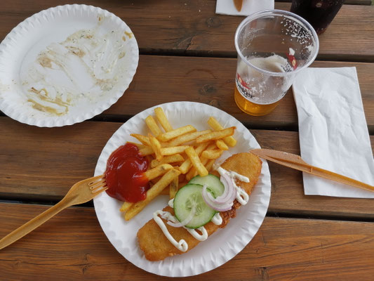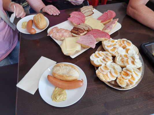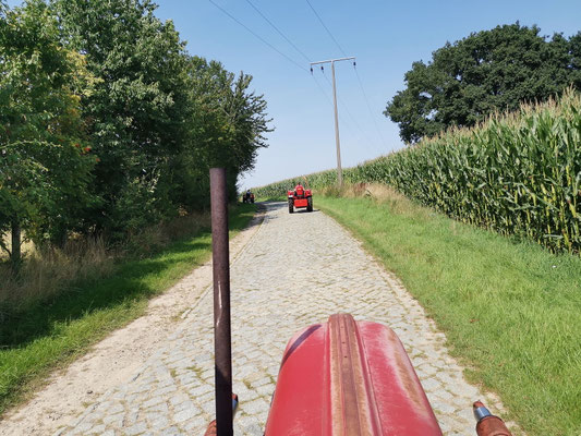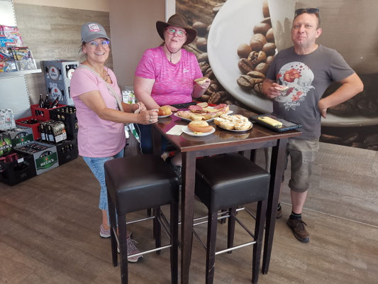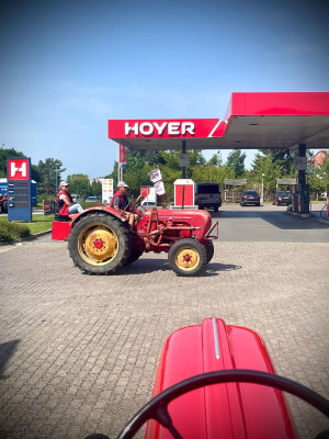 Mittagspause einmal anders. Während die Trecker mit gutem Diesel versorgt wurden, gab es für uns lecker Bockwurst und frisch belegte Brötchen. Einfach gut, diese Tankstelle muss man sich unbedingt merken. Merken muss man sich auch diese Straße, was nicht zuvor bombenfest war, war hinterher sicher lose. Uns taten nur die Wohnwagen von Wolfgang und Ludger/Anke leid.