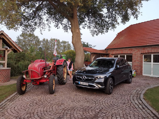 Drei Generationen der Landwirtschaft. Pferd, Trecker Baujahr 1962 und Trecker Baujahr 2024. Man beachte die Vorderräder des Fendt sind größer als die Hinterräder des größten von Porsche jemals gebauten Treckers.