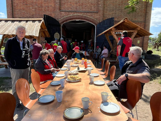 Auch die Gruppe in Eldena ( Klaus, Wolfgang, Ingo, Ludger & Anke, Andi & Sandra, Gerd & Gela) machte sich pünktlich um 9:00 Uhr auf den Weg gen Norden. Kurz hinter Grabow gesellten sich dann noch Thomas und Andrea hinzu und so ging es hinter Andi's Super 308 nach Neustadt Glewe und zu seiner Hoyer Niederlassung. Nochmal kurz einen Kaffee trinken, eventuell die Toilette aufsuchen und schon ging es weiter vorbei den den Fischteichen der Lewitz weiter nach Warin.